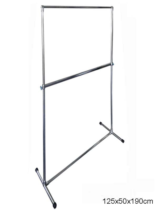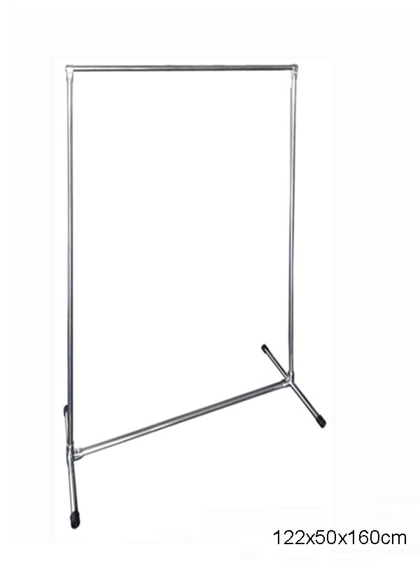 Ekonomični fiksni štender slobodnostojeći za odeću, sjajan, od okruglih cevi fi25mm . Dužina: 102 cm Visina: 160 cm . Dubina: 50cm Materijal: čelik, Obrada: hromiran
