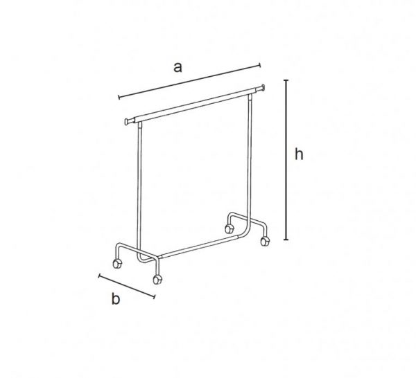 Snažan štender slobodnostojeći za odeću, sjajan, od okruglih cevi fi 28mm sa točkićima. Dužina: 100-170 cm Visina: 154 cm sa točkićima. Širina: 57cm Materijal: čelik, Obrada: hromiran