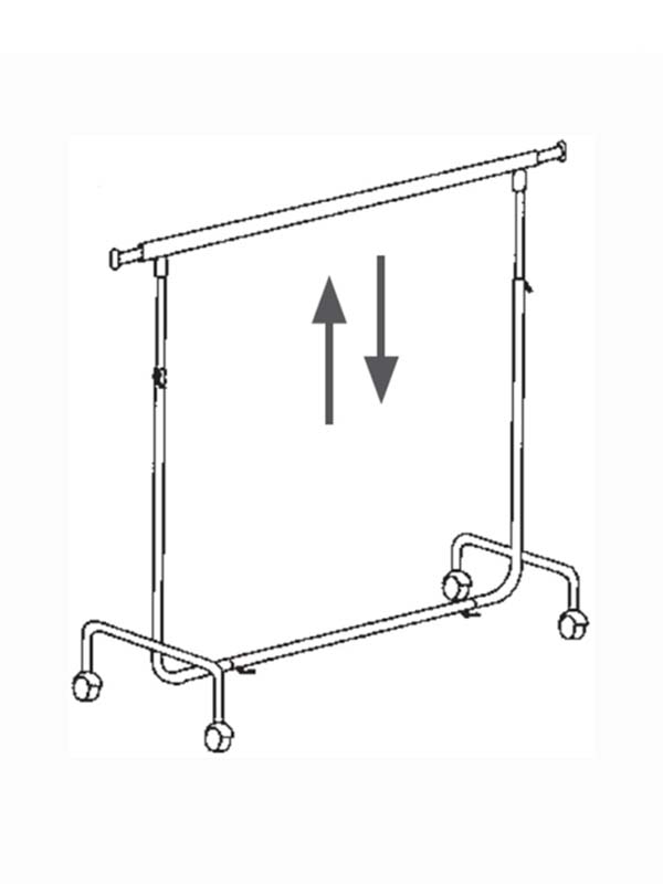 Snažan štender slobodnostojeći za odeću, sjajan, od okruglih cevi fi 28mm sa točkićima. Dužina: 143-223 cm Visina: 106-200 cm sa točkićima. Širina: 55cm Materijal: čelik, Obrada: hromiran